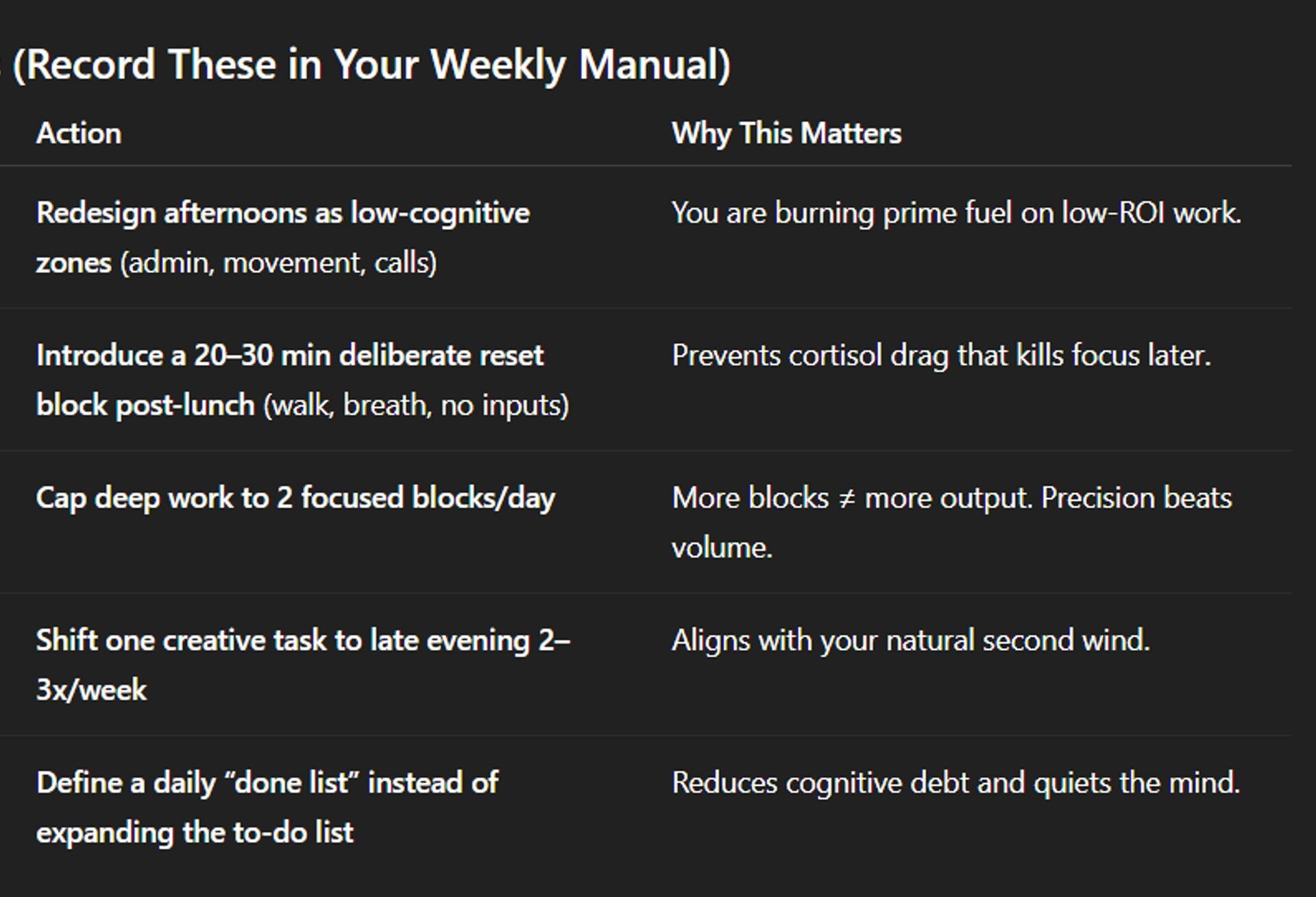 In this case, it picked up on a mid-day energy drop and recommended that I not use mid-afternoons for deep work (this is when context-switching is high for me).