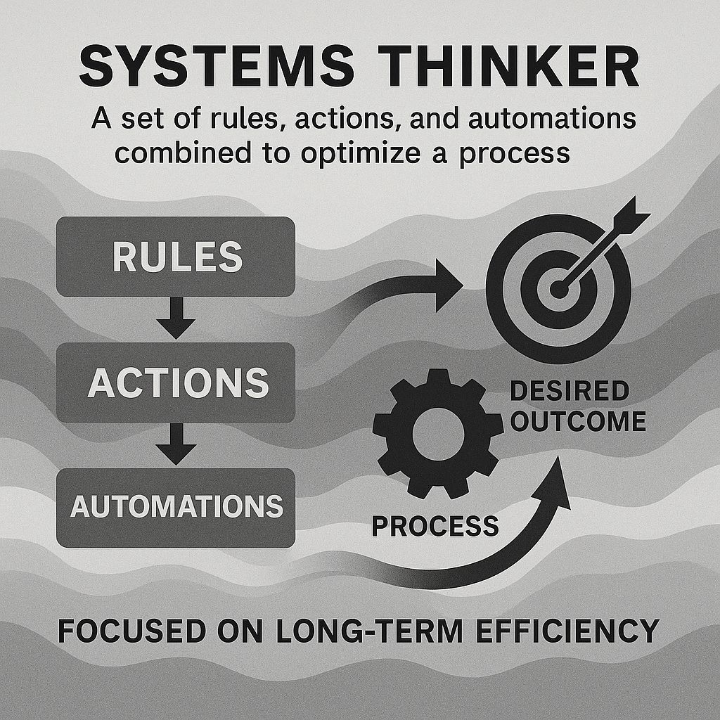 Being a systems thinker means that rather than trying to jump directly to favorable outcomes, you instead focus your energy on developing the set of rules, actions, and automations that, when combined, will lead to desired outcomes with minimal sustained effort on your part.